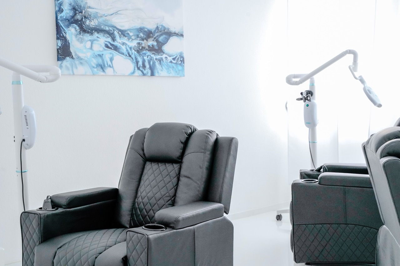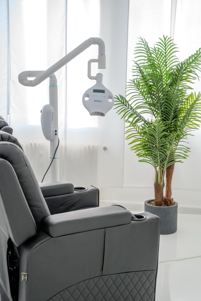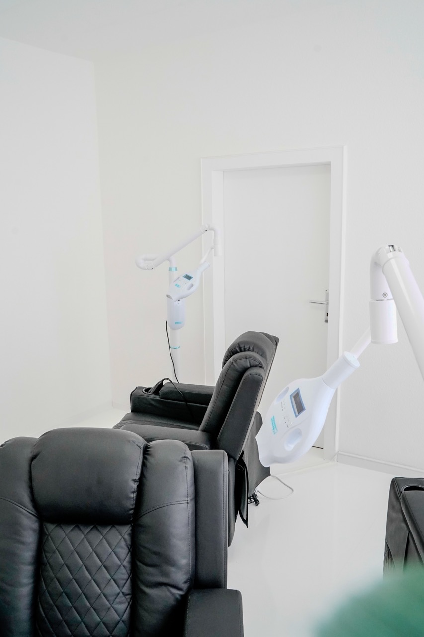 Genieße während deiner Zahnaufhellung in unseren luxuriösen Sesseln mit integrierter Handyhalterung kostenloses WLAN und schaue mit deinen eigenen Kopfhörern entspannt deine Lieblingsserien auf Netflix oder YouTube!